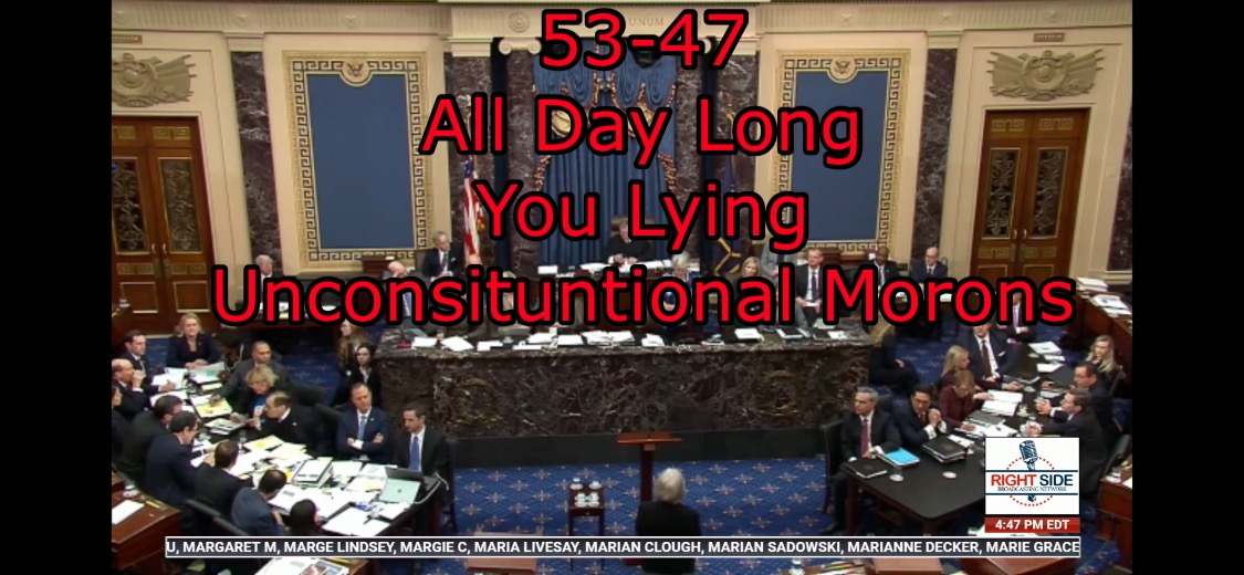 123 53-47 All Day Long. You Lying Unconsituntional Morons! (files.catbox.moe) MAGA submitted by MAGA2020KEK 2 comments hide save share deport Comments (2) sorted by: top new old ▲ ▼ – rextexMG (4 points) Now move to vote for acquittal and end this farce permalink deport reply ▲ ▼ – Landslide_2020 (4 points) I heard that Susan Collins did crossover and vote with the Demoncrats on one of the amendments. Could someone verify that for me. I was watching Hogan's Heroes and I missed it. permalink deport reply