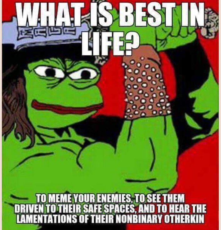 20 What is best in life..... (i.postimg.cc) submitted by KrakenTheDeepState 1 comments hide save share deport Comments (1) sorted by: top new old You're viewing a single comment thread. View all comments, or full comment thread. ▲ ▼ – MAGAyote (0 points) "They" can keep their lamentations to themselves. No purple haired xirs for me thank you very much! permalink deport reply
